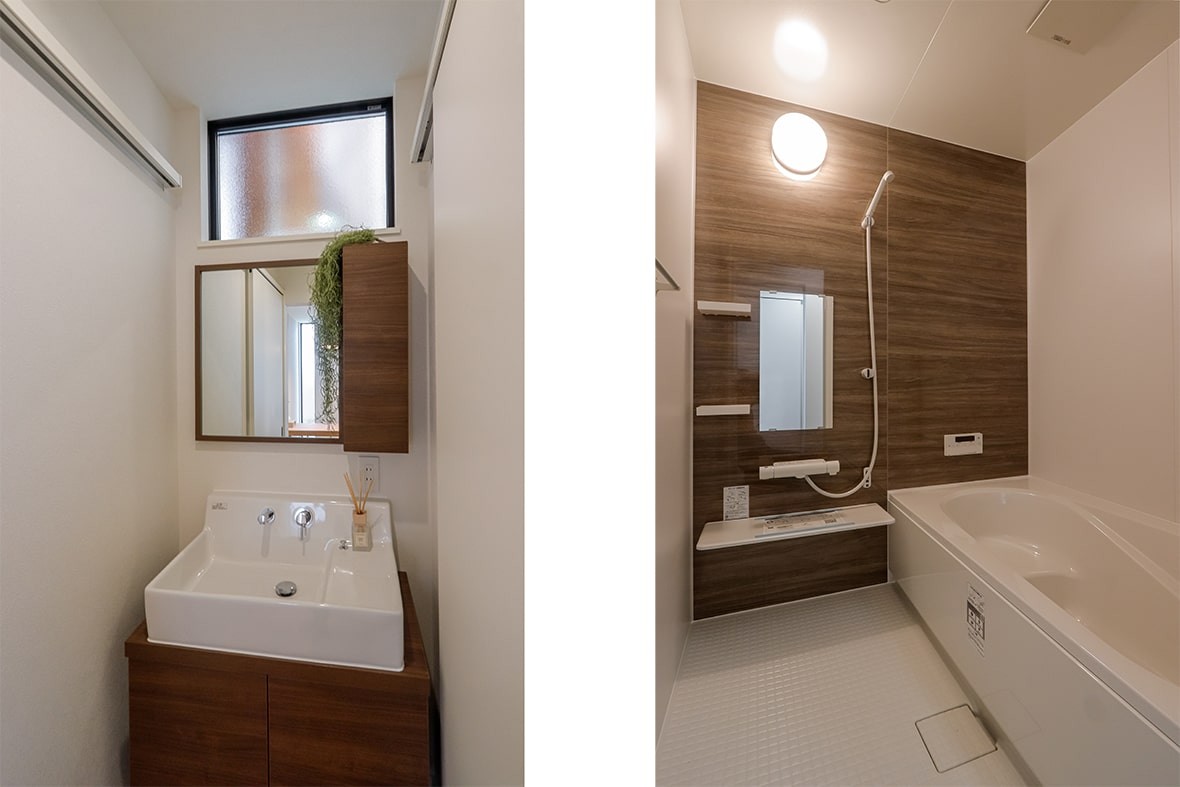 洗面やお風呂は、木目調の面材やパネルを使い、